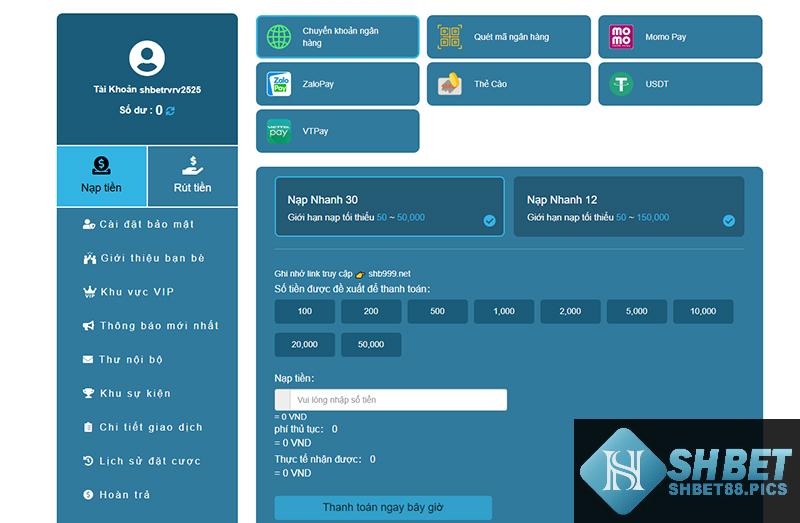 Hiện tại, bên phía nhà cái uy tín Shbet đang hỗ trợ người chơi giao dịch nạp tiền qua ngân hàng, mã QR, ví momo, ví zalo, thẻ cào điện thoại, tiền ảo USDT, ví Vtpay.