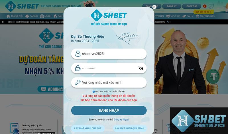 Bước 3: Điền chính xác thông tin tài khoản Shbet của bạn vào ô đăng nhập. Sau đó, nhấn đăng nhập để kết nối đến máy chủ của nhà cái.